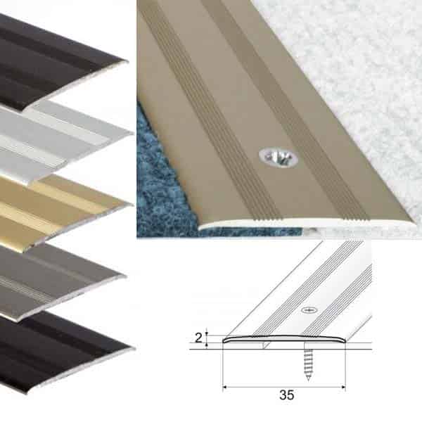 Excellent quality Flat Anodised Aluminium Door Threshold. They come in a very attractive finishes with many options to match your floor. Each trim comes pristine in manufacturers packaging supplied with installation screws and plugs.